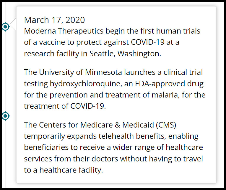 הרי באתר ציר הזמן של ה-CDC כתוב במפורש שרק בתאריך ה-17.3.2020 החל הניסוי הראשון של חיסוני קוביד-19 על בני אדם בחברת מודרנה, במתקן מחקר בוושינגטון.