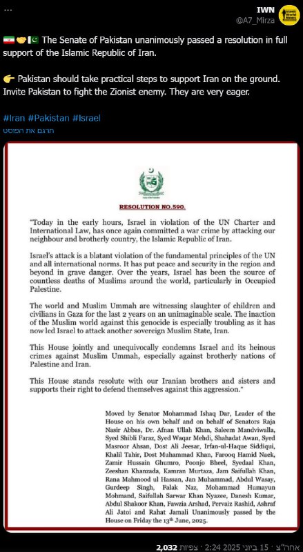 מצטרפים לאיראן: הסנאט בפקיסטאן העביר פה אחד החלטה בתמיכה מלאה ברפובליקה האסלאמית של איראן@NISTAROT | רב הנסתר בטלגרםבמקביל פקיסטאן הצהירה