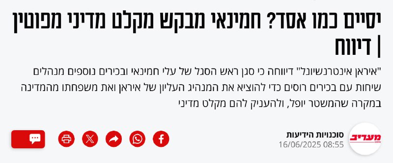 "איראן אינטרנשיונל" מדווחת: בכירים באיראן מנהלים שיחות עם בכירים רוסים כדי להוציא את המנהיג העליון של איראן ואת משפחתו מהמדינה