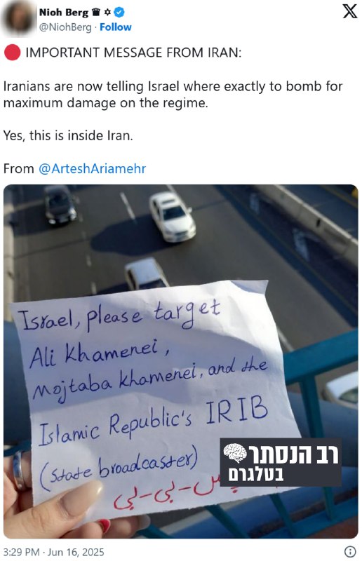 פתק מתוך איראן: "בבקשה חסלו את חמינאי"@NISTAROT |רב הנסתר בטלגרםהאיראנים מבקשים על ידי פתקים ומסרים אחרים "חסלו את חמינאי", אתמול