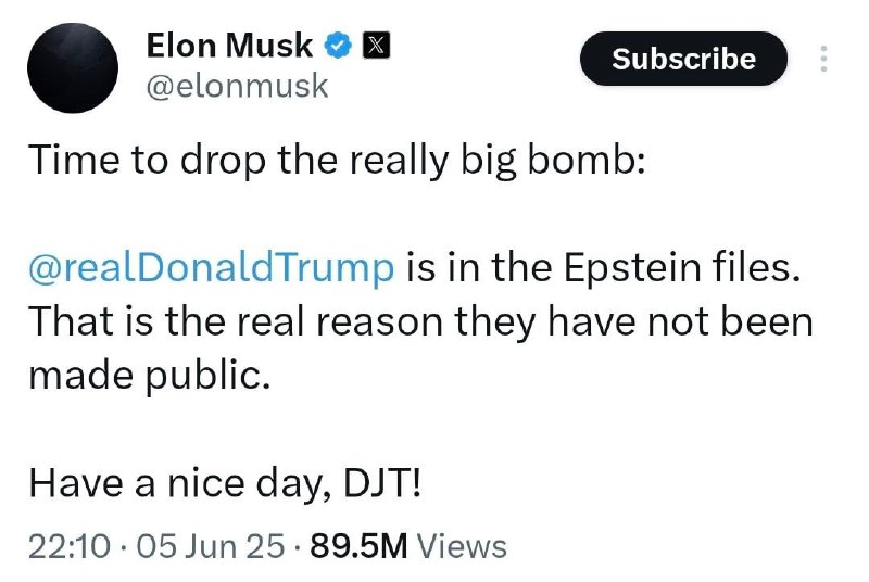 לאחר שהסתכסך עם נשיא ארה"ב, אילון מאסק מטיל פצצה: דונאלד טראמפ נמצא בתיקי ג'פרי אפשטיין (פדופיליה), זו הסיבה האמיתית לכך
