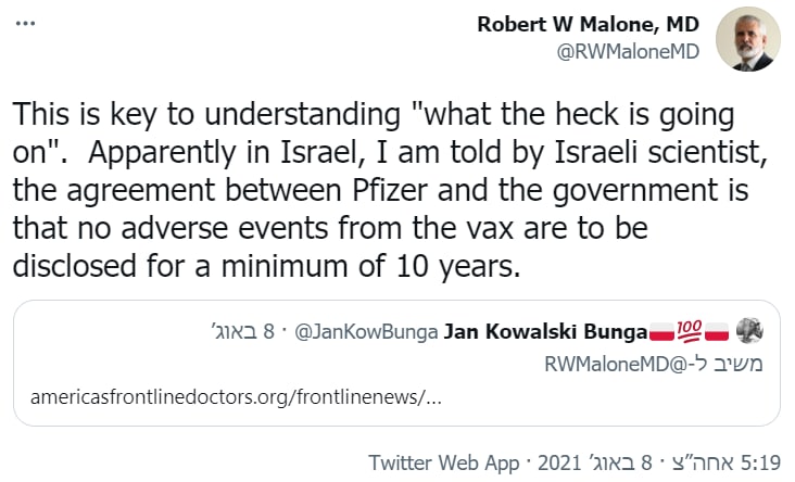 רעידת אדמה: ממשלת ישראל התחייבה לחברת פייזר שלא לחשוף אירועים שליליים שנגרמו מהחיסון במשך 10 שנים@NistarotChat | רב הנסתר בטלגרםרוברט