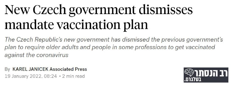 ממשלת צ'כיה החדשה: מנדט חיוב "התחסנות" שהטילה הממשלה הקודמת בוטל@Nistarot | רב הנסתר בטלגרםממשלת צ'כיה החדשה ביטלה את תוכנית הממשלה