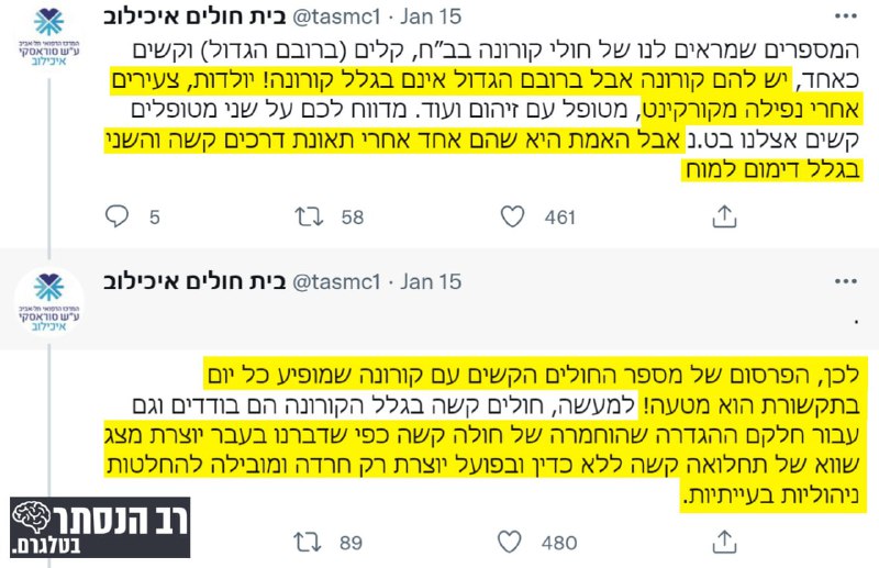 ביה"ח איכילוב בטוויטר הרשמי: פרסום מספר החולים קשה עם קורונה שמופיע כל יום בתקשורת הוא מטעה@Nistarot | רב הנסתר בטלגרםביה"ח