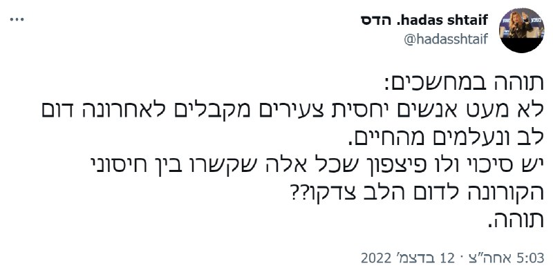 העיתונאית הבכירה הדס שטייף: תוהה במחשכים, לא מעט אנשים יחסית צעירים מקבלים לאחרונה דום לב ונעלמים מהחיים. יש סיכוי ולו
