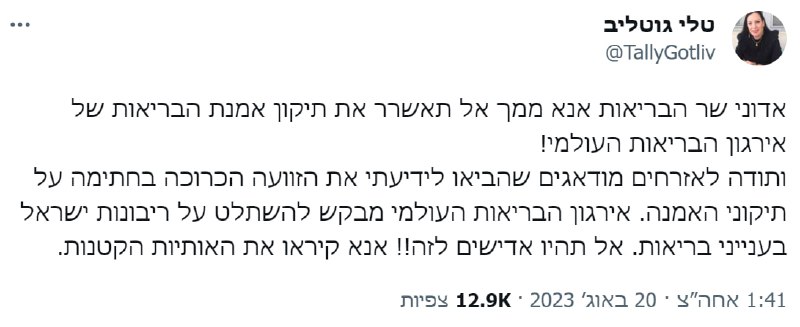 ח"כ ועו"ד טלי גוטליב: אדוני שר הבריאות אנא ממך אל תאשרר את תיקון אמנת הבריאות של אירגון הבריאות העולמי@NISTAROT |