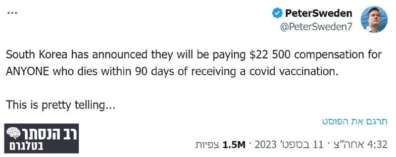 ממשלת דרום קוריאה בהצהרה: נשלם 22,500 דולר כפיצוי על כל אדם שנפטר תוך 90 ימים מיום שקיבל את חיסון הקוביד-19@NISTAROT